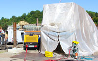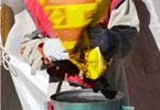 Das Abstrahlen der Oberfläche kann manchmal mehrere Arbeitsschritte erfordern. Wurde das Objekt sorgfältig gesandstrahlt, beginnen wir mit den Aufräumarbeiten. Dazu gehört auch das Bergen und Entsorgen des Strahlmittels.